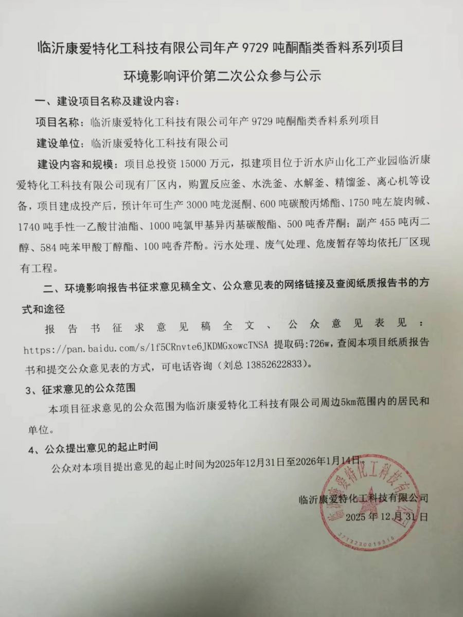临沂康爱特化工科技有限公司年产9729吨酮酯类香料系列项目 环境影响评价第二次公众参与公示