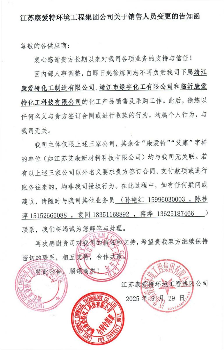 江苏康爱特环境工程集团公司关于销售人员变更的告知函